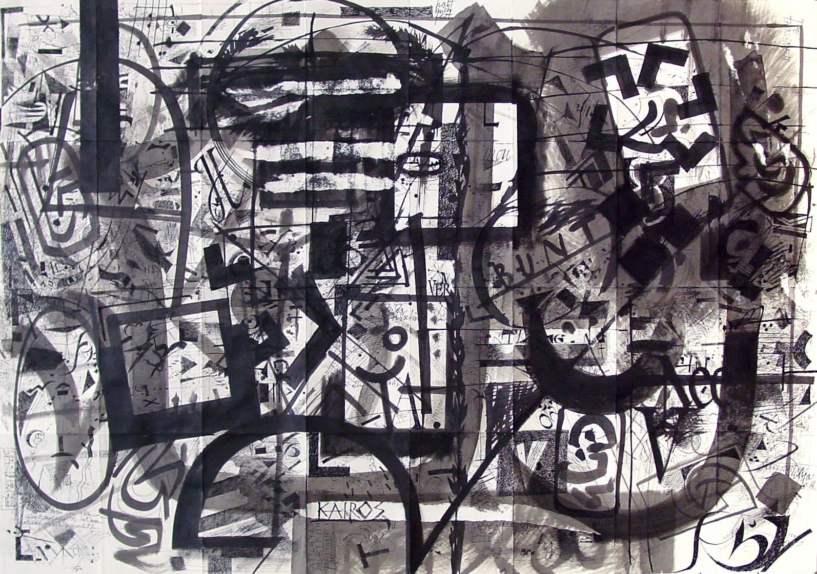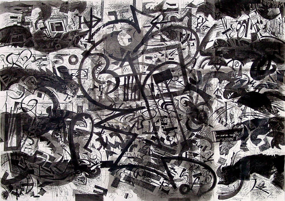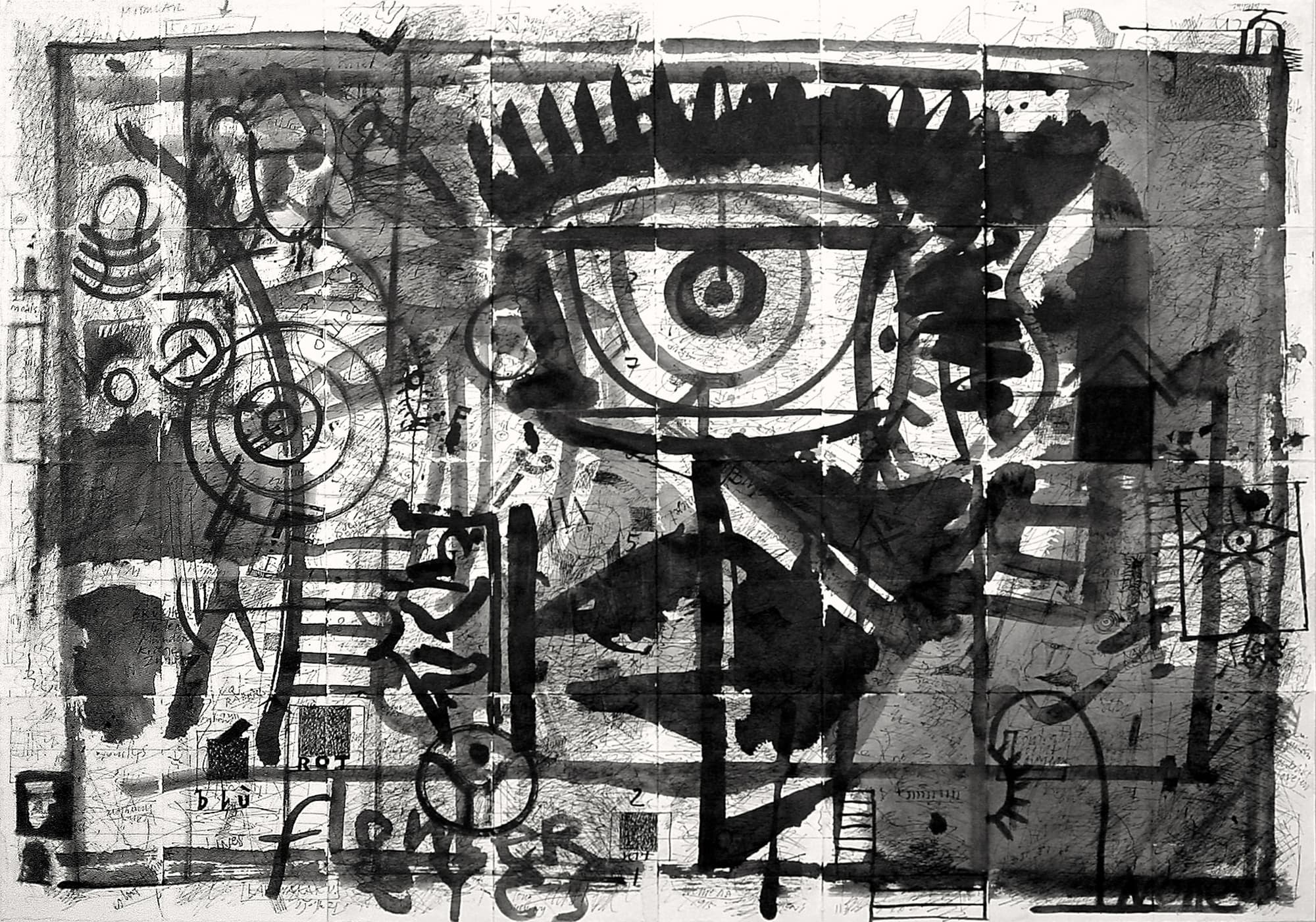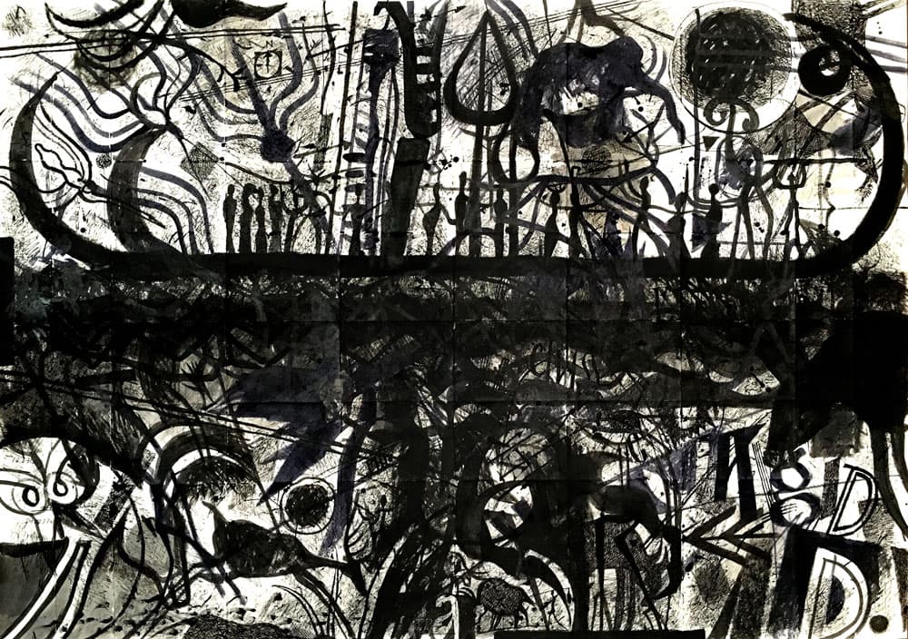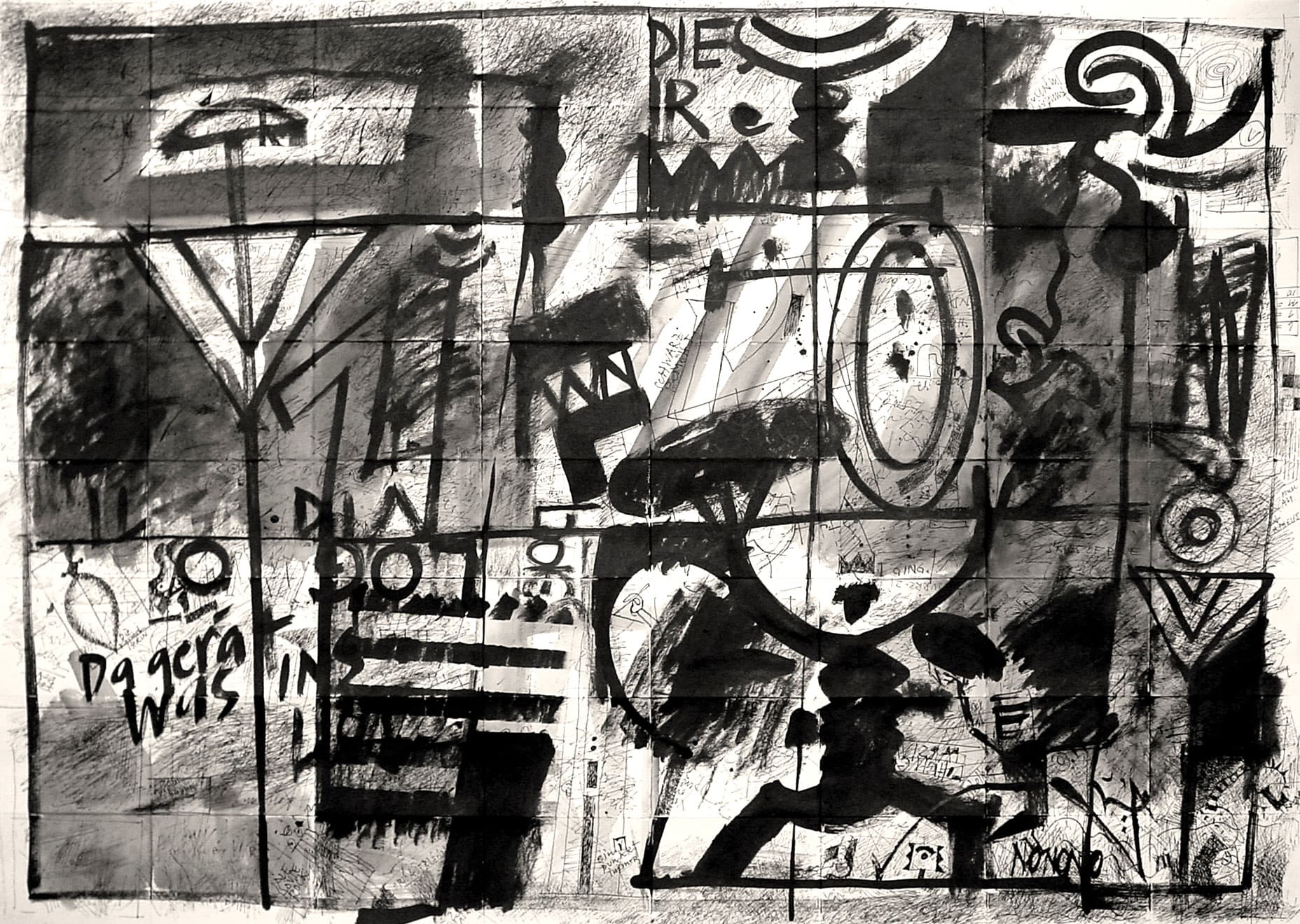 Was zuerst den Eindruck eines chaotischen Gekritzels erweckt, wird in einem abschliessenden Arbeitsvorgang neu strukturiert. Zum Einsatz kommen nicht nur Feder und Tusche, sondern auch Weisshöhungen mit Pinsel.