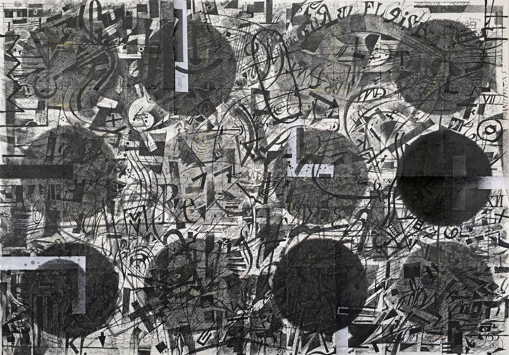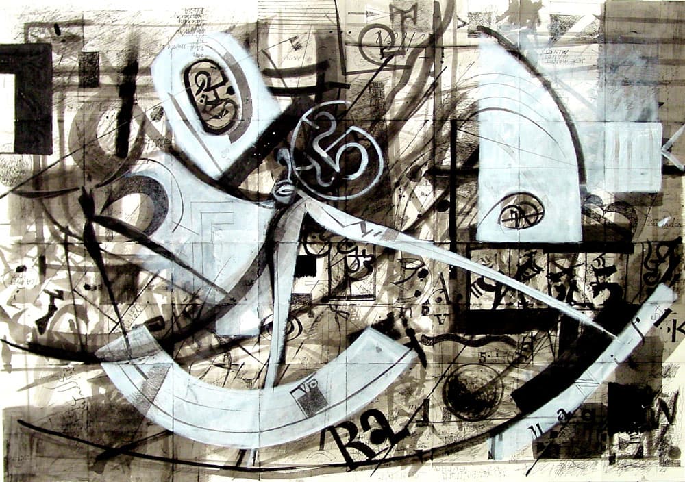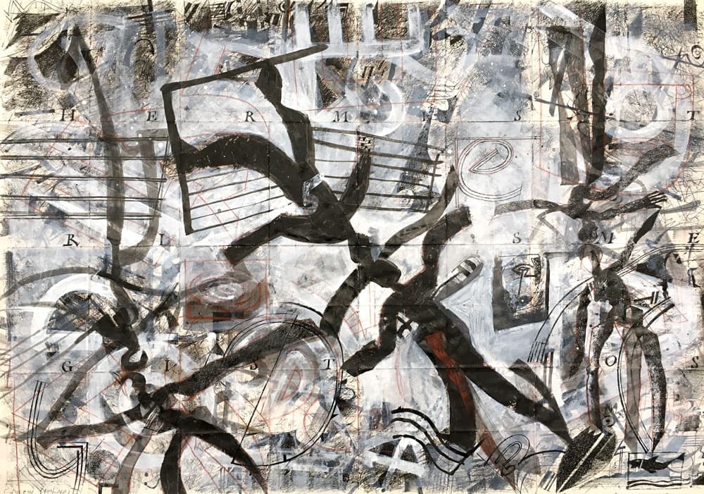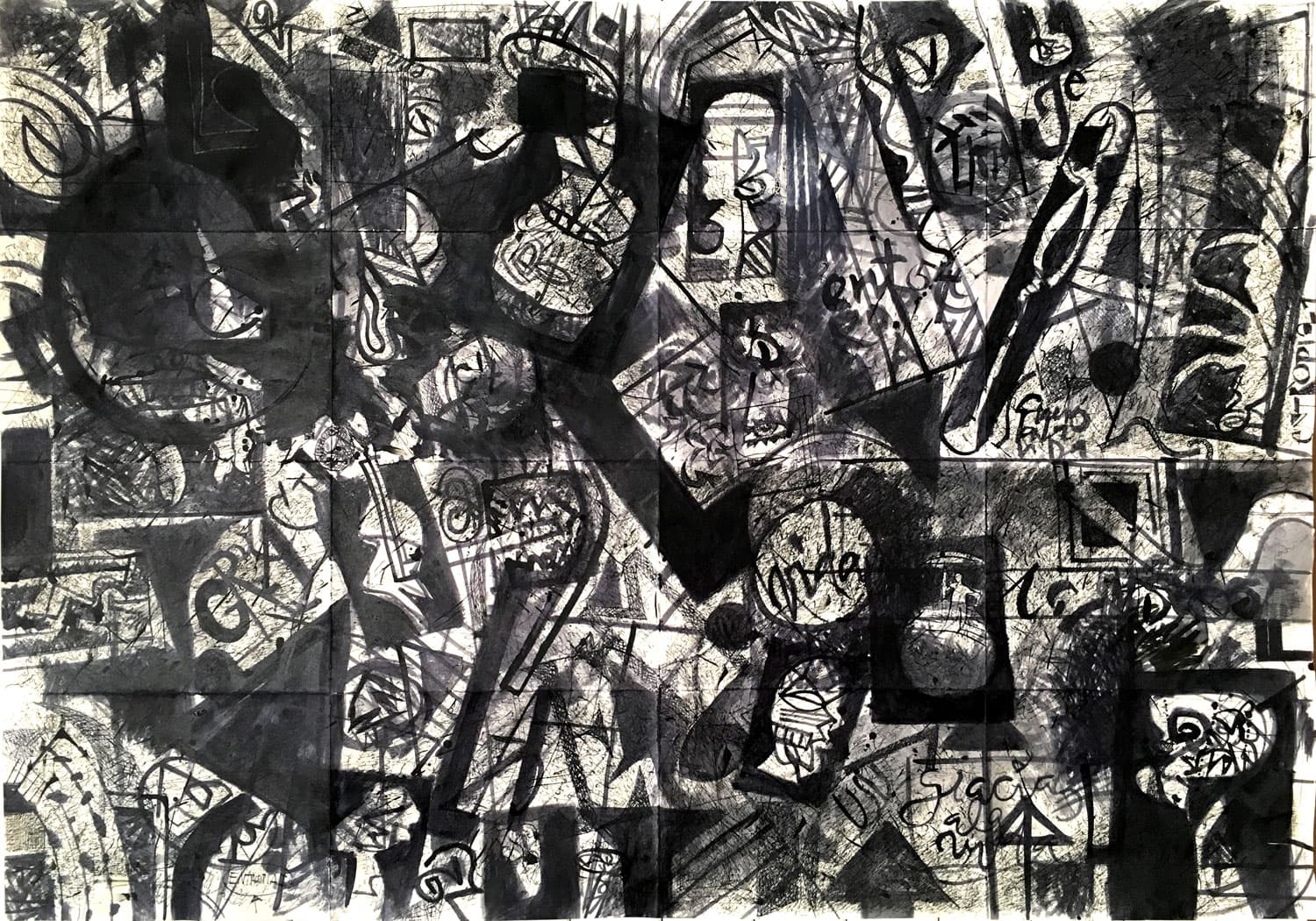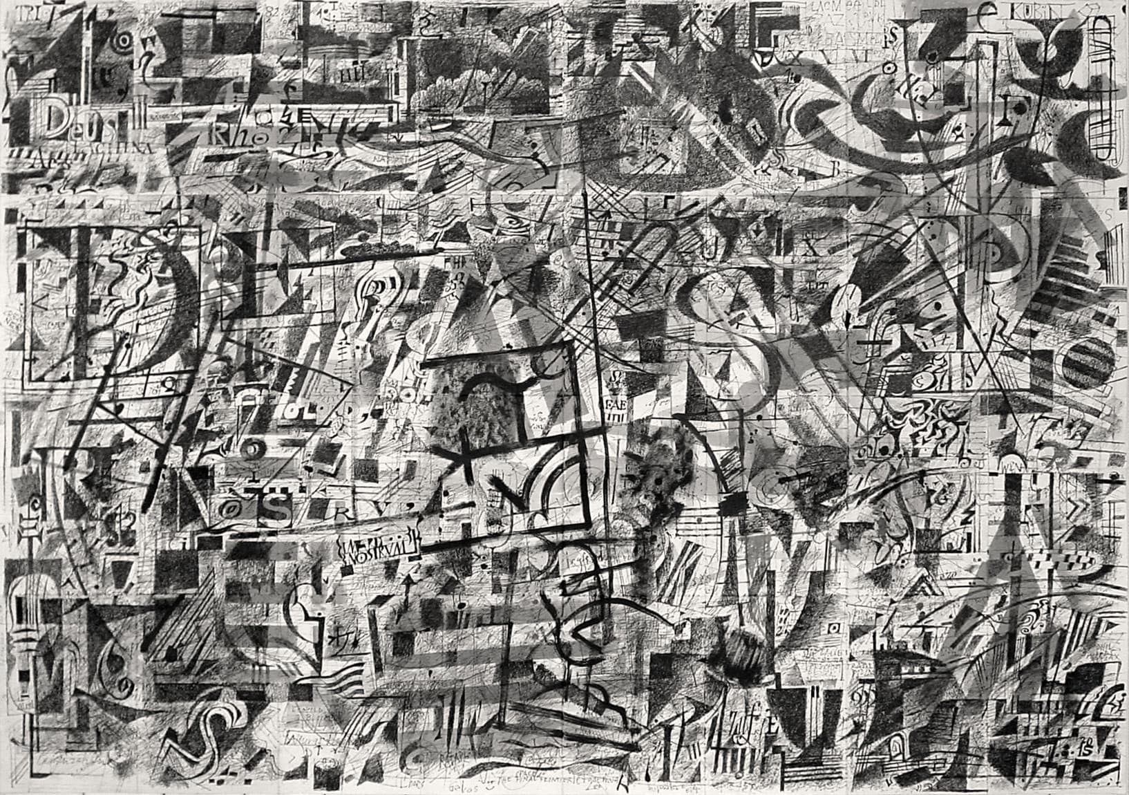 Was zuerst den Eindruck eines chaotischen Gekritzels erweckt, wird in einem abschliessenden Arbeitsvorgang neu strukturiert. Zum Einsatz kommen nicht nur Feder und Tusche, sondern auch Weisshöhungen mit Pinsel.